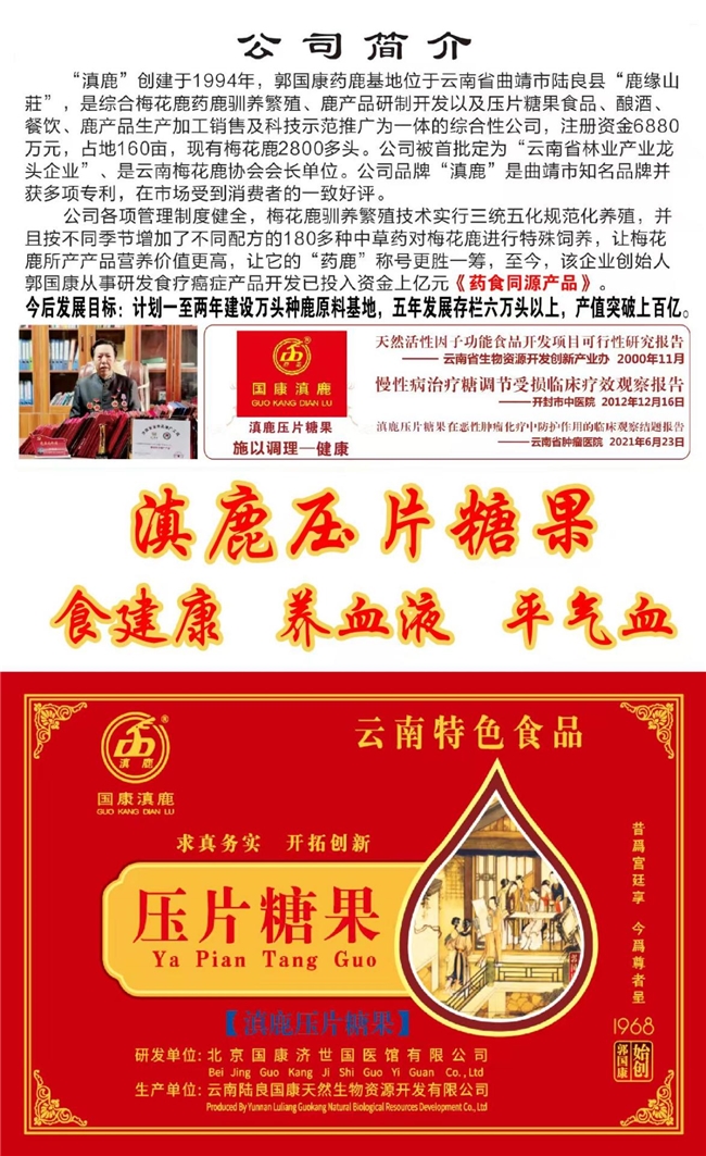 云南陆良国康天然生物资源开发有限公司,创建1994年,占地160亩,现有梅花鹿2800多头。集梅花鹿养繁殖、鹿产品研制开发、酿酒、餐饮、鹿产品生产销售及科技示范推广为一体。云南陆良国康天然生物资源开发有限公司是一家自主创新的科技企业,公司被首批定为“云南省林业产业龙头企业”、是云南梅花鹿协会会长单位。被评为中国最具投资潜力民营科技型企业,中国工业合作协会绿色健康产品促进中心评为中国低碳绿色创新企业,中国品牌协会合作单位,中国品牌协会高质量产品,云南省5A级诚信企业。