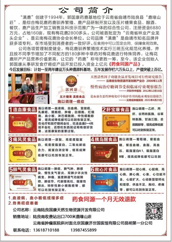 公司各项管理制度健全,梅花鹿驯养繁殖技术实行三统五化规范化养殖,并且按不同季节增加了不同配方的180多种中草药对梅花鹿进行特殊饲养,让梅花鹿所产产品营养价值更高,让它的“药鹿”称号更胜一筹。至今,该企业创始人郭国康从事研发食疗癌症产品开发已投入资金上亿元《药食同源产品》。