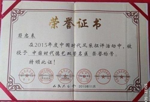 2015年11月在人民大会堂受到国家工商联副主席王治国亲切接见!并授于中国时代德艺双馨名医,荣誉称号