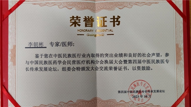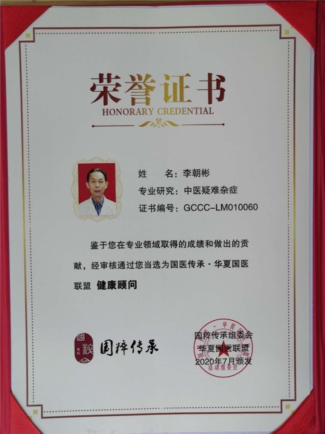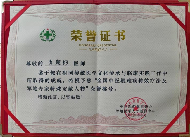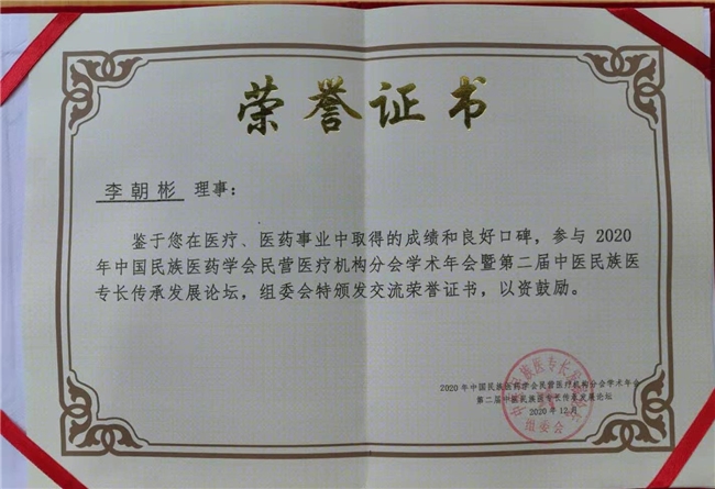 2016年参加第六届全国名老中医开发协会被评为“中医疑难特效诊疗人才"。