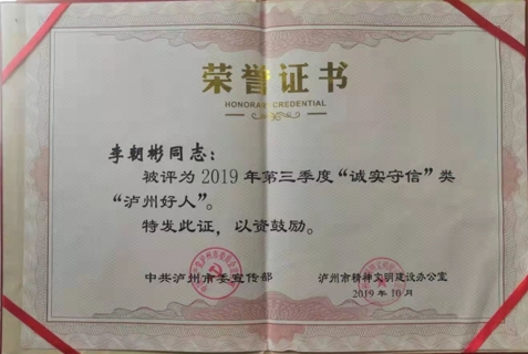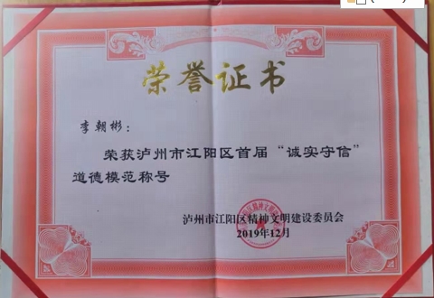 2019被江阳区评为江阳好人,被评为江阳区道德模范先进个人。