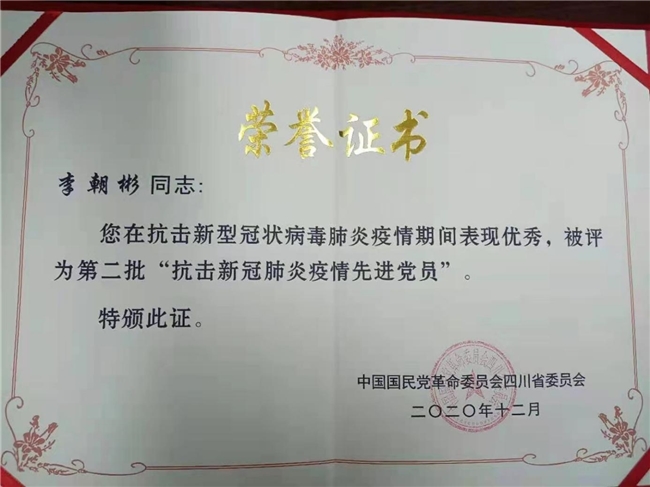 “十佳特色诚信中医诊所”等称号。2019年12月,他还光荣地上榜“泸州好人”“江阳区首届道德模范”。这些荣誉,正是他与党同心同向同行,坚持为国分忧、为民解难最好的诠释。民革党员李朝彬是党的领导下,人民团结一心、奋勇战“疫”的一个代表。在十四亿人民的自发担当和齐心努力下,战胜疫情已经指日可待,南疆北国,接连传来复工复产的消息。“隆隆惊雷扫瘟疫,簇簇芳卉迎新春。”可爱的祖国,必将迎来欣欣向荣的春天!