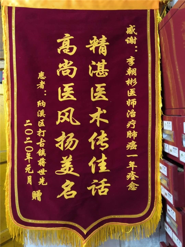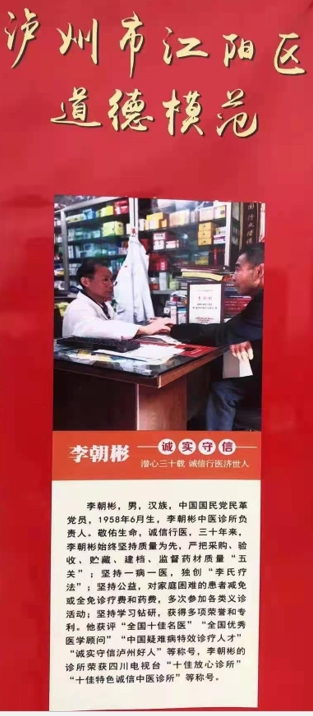 2015年至2017年间,陆续向中华人民共和国国家知识产权局提交申请了8 份中药专利,分别是:一种治疗皮肤病的中药组合物;一种治疗肝硬化的中药组合物;一种治疗甲亢的中药组合物;一种治疗糖尿病的中药组合物;一种治疗肾结石的中药组合物;一种治疗不孕不育的中药组合物;一种治疗肺癌、咳嗽、咳血的中药组合物;一种治疗乳腺癌及乳腺囊肿、包块、疼痛的中药组合物。辛苦几十年,终于有了自己的科研成果,更为中医药事业的发扬光大做出了巨大贡献。发扬祖国医学知识,传承中医技术精随,振新强大中医事业,中医文化更新发展。人生的宗旨是,不断求索真知,不断进取和奉献,而获取人生快乐。以人为本,以法为先,文明行医,以德为先。文明礼貌,态度和蔼。踏实过好每一天,认真做好每件事,不求奢求惊天动地,但愿能无愧此生。不断总结,不断进取,慈善为本,全心全意为人民的健康做出应有的贡献.“没来得及多想,我第一个反应就是发口罩!”正月初一,欢天喜地的春节才刚“登台”,就被来势汹汹的新型冠状病毒感染的肺炎疫情紧急“关停”了。这一天,泸州市启动突发公共卫生事件一级应急响应,宣布全市全员进入“战时应急状态”。民革江阳区支部党员、62岁的中医李朝彬,也用他的方式进入了战疫“一级响应”。